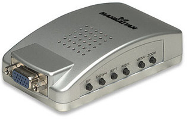 The pocket-sized MANHATTAN PC TV Converter is USB-powered to eliminate the need for bulk external power supplies or adapters for use almost anywhere. An input DB15 (VGA) port and composite video (RCA), S-video and HD15 (VGA) output ports make it compatible with almost any video system.