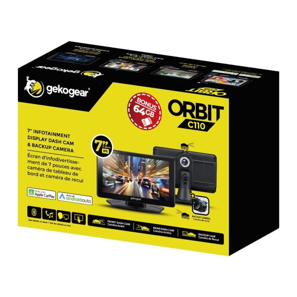 The GekoGear Orbit C110 features a 7-inch touchscreen display with wireless Apple CarPlay and Android Auto, it also includes a front and rear dash cam.
